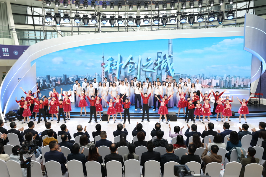 科技先锋代表和青年科技工作者合唱《科创之城》。