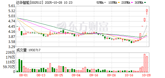 达华智能(维权)盘中涨停,已连收4个涨停板,截至9:34,该股报5.40元,换手率13.46%,成交量1.47亿股,成交金额7.75亿元,涨停板封单金额为1.12亿元。连续涨停期间,该股累计上涨46.74%,累计换手率为44.58%。最新A股总市值达60.07亿元,A股流通市值59.10亿元。